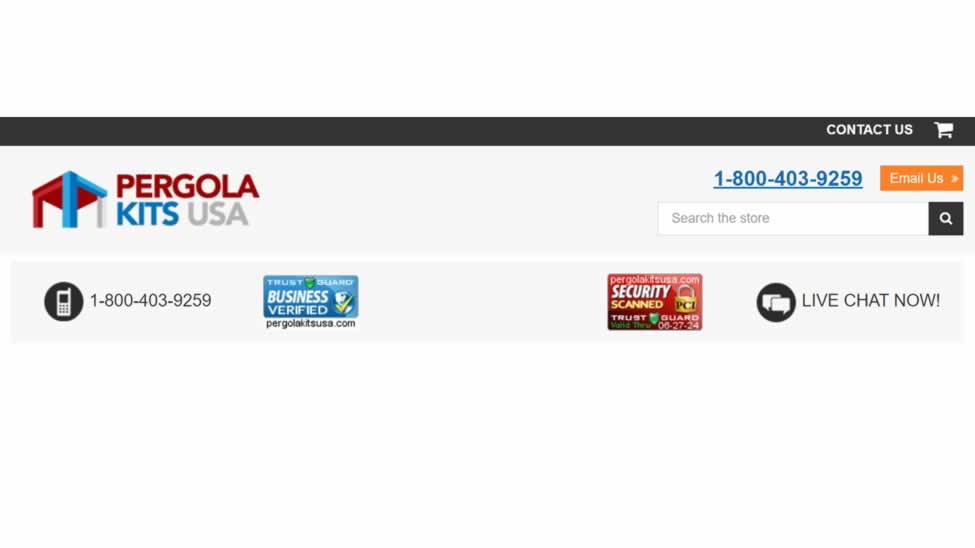 Pergola Kits USA, a company designing and selling pergola and pavilion kits, sets an excellent example of this practice. Their website features multiple contact methods prominently displayed in the top header and the footer. These include a live chat option, a phone number, and an email number.