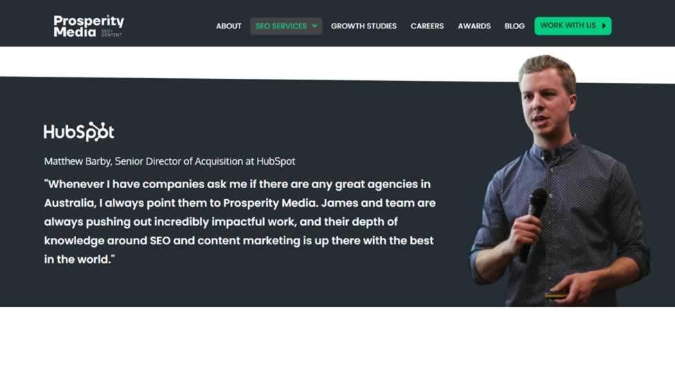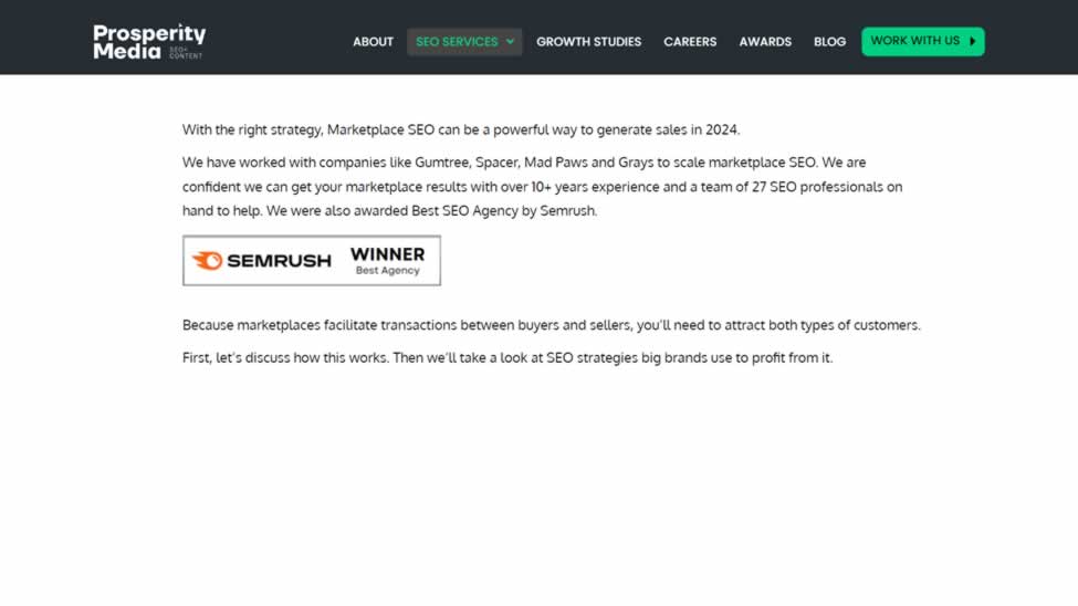 A standout example of this strategy in action is Prosperity Media, a digital PR and SEO agency. On their Marketplace SEO page, they highlight a prestigious award they received for their expertise in their field.