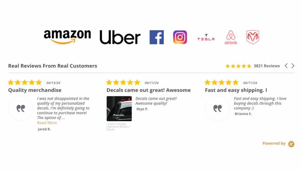 Vinyl Status is a custom sticker service that uses a dynamic approach by featuring a customer reviews carousel at the bottom of their homepage.