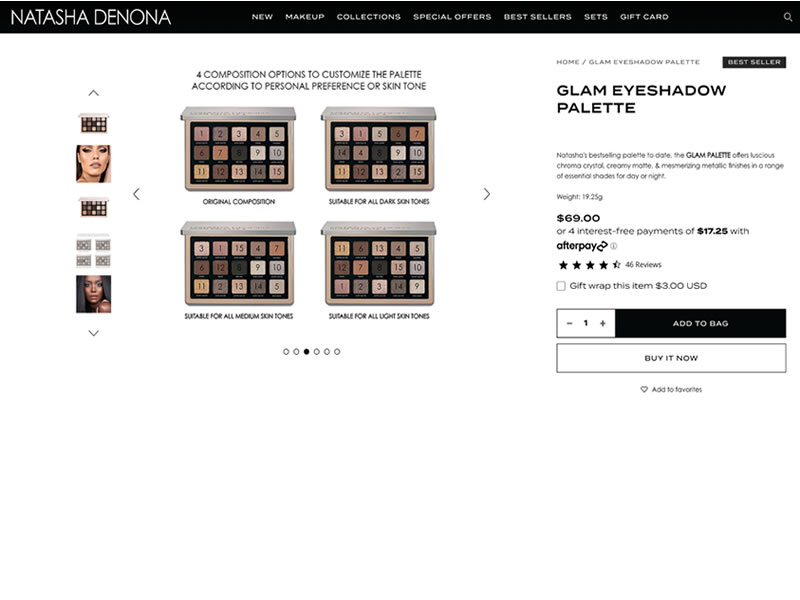 Look at Natasha Denona. All of her product pages have the same elements: what the product does, a description of the shades, a list of ingredients, and details about shipping and returns.