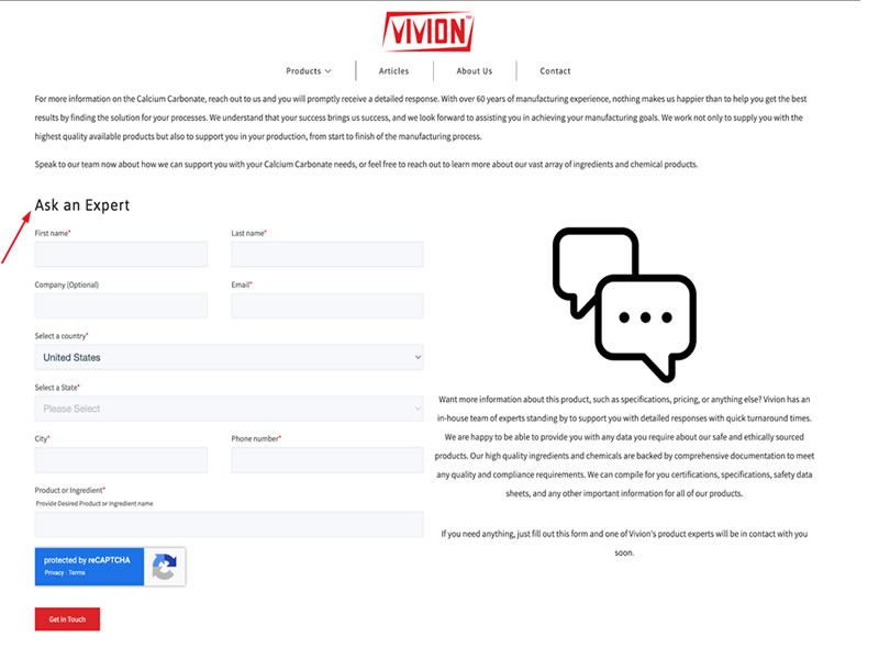 Check out this bulk calcium carbonate page. They have a "Ask an Expert" section that encourages shoppers to get in touch and learn everything they need about the product. Since the product in question also isn't everything you buy every day, this simple element is a great conversion-boosting tool.