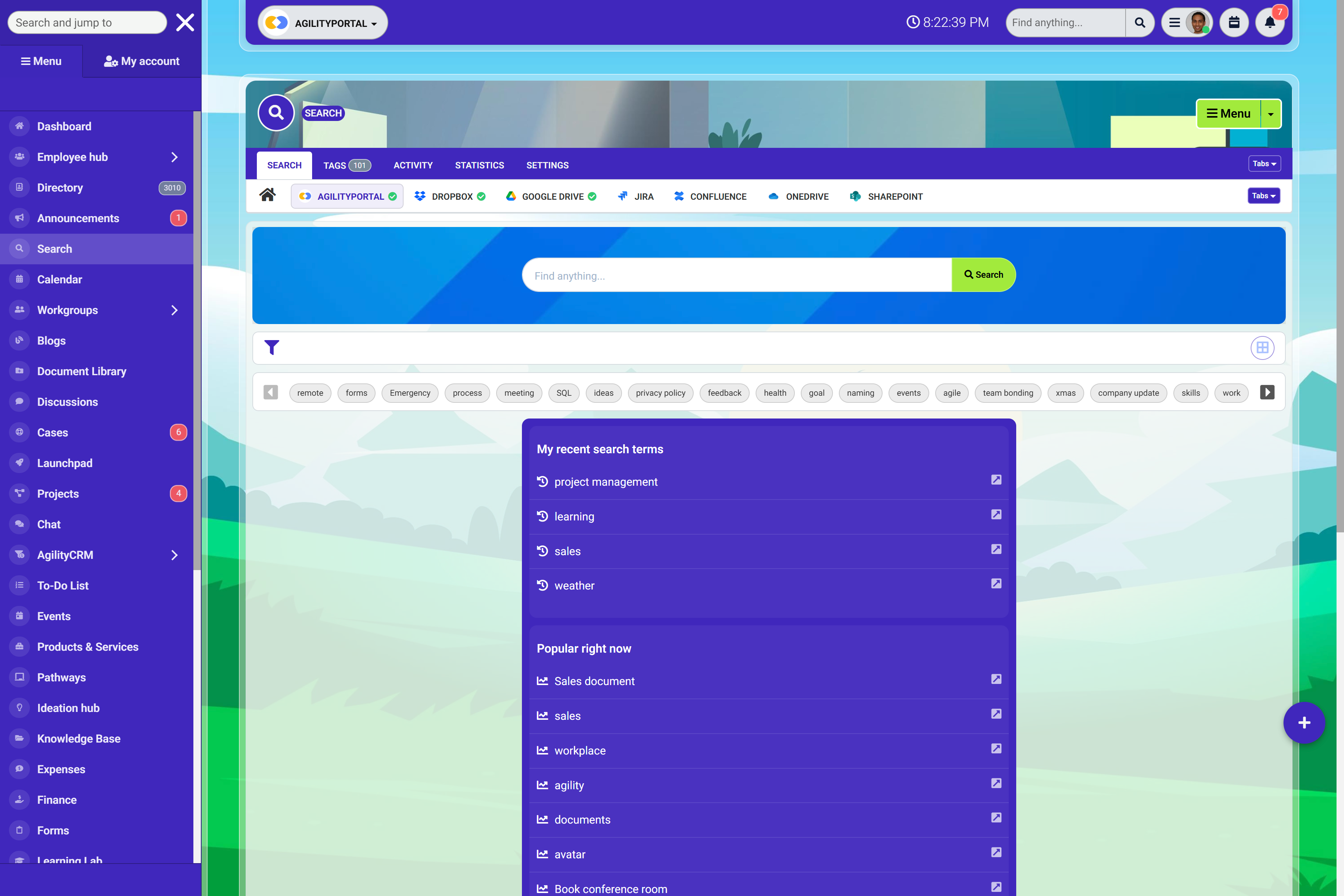 - AgilityPortal acts as a digital headquarters, mimicking the physical office with spaces for departments, projects, ideation, and collaboration — making it ideal for organizations that want a unified, people-first digital workplace. Take a look at the feature list.