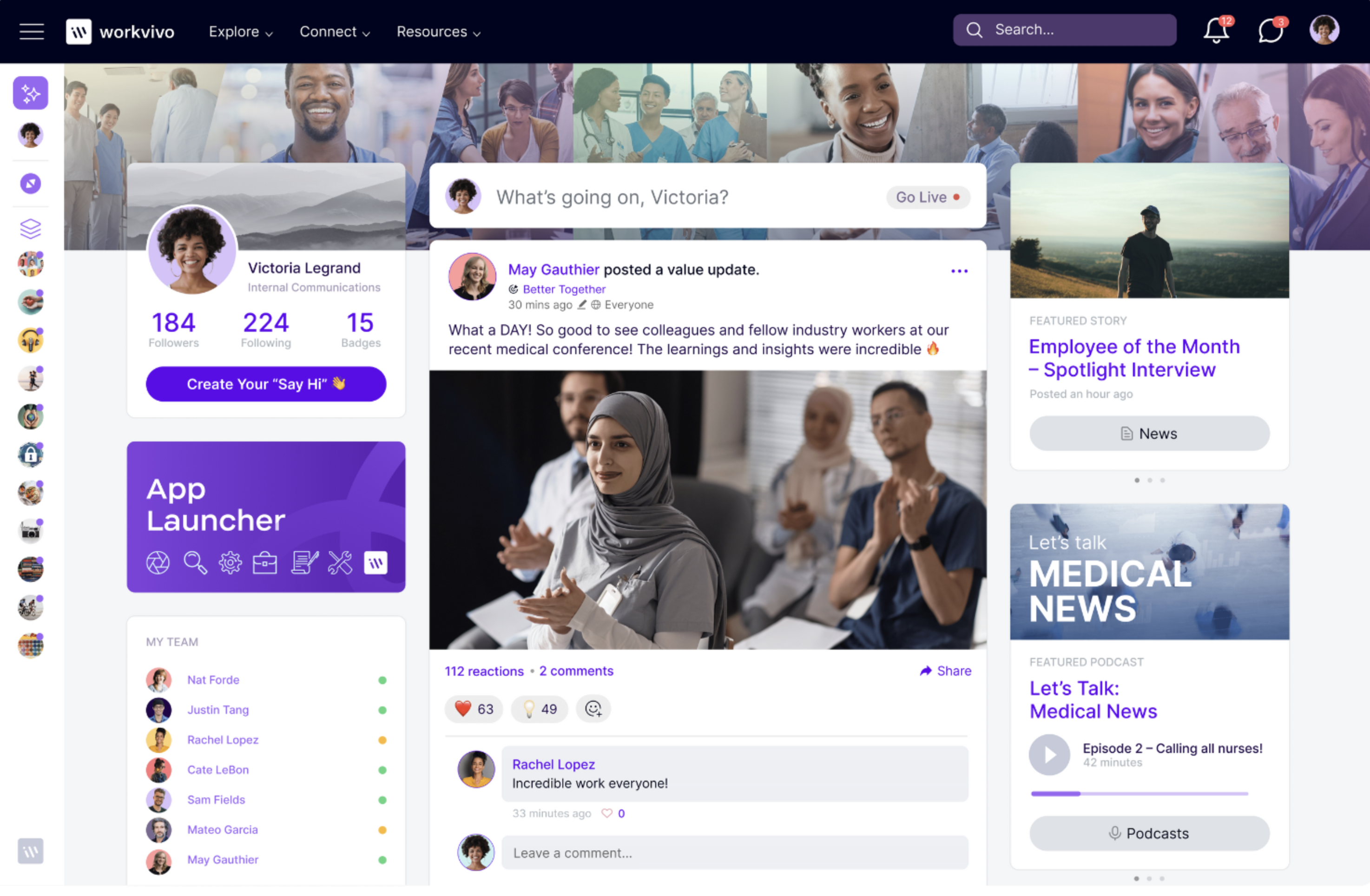 At its core, Workvivo feels more like an internal social network for employees, where staff can share updates, celebrate wins, recognize peers, and stay connected to the company's mission. Its design mirrors familiar social media feeds, which makes adoption easier for employees who are used to scrolling, liking, and posting in their personal lives.