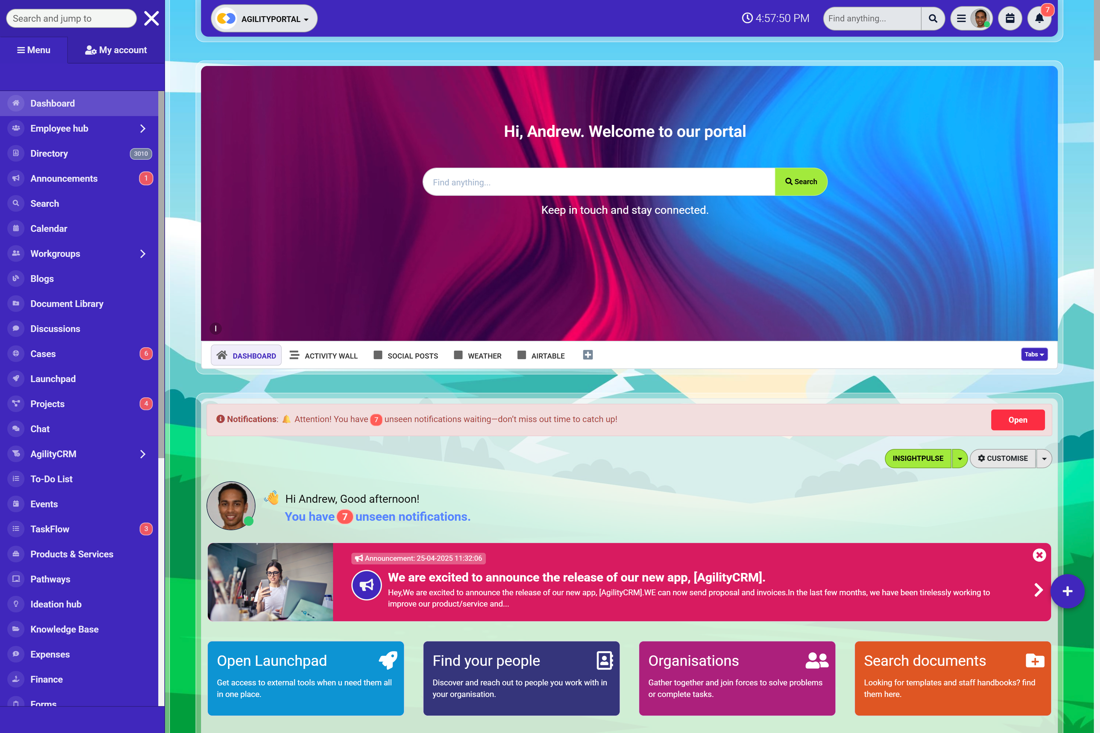 AgilityPortal is a cloud-based workplace hub designed to serve as the digital backbone of modern organizations.