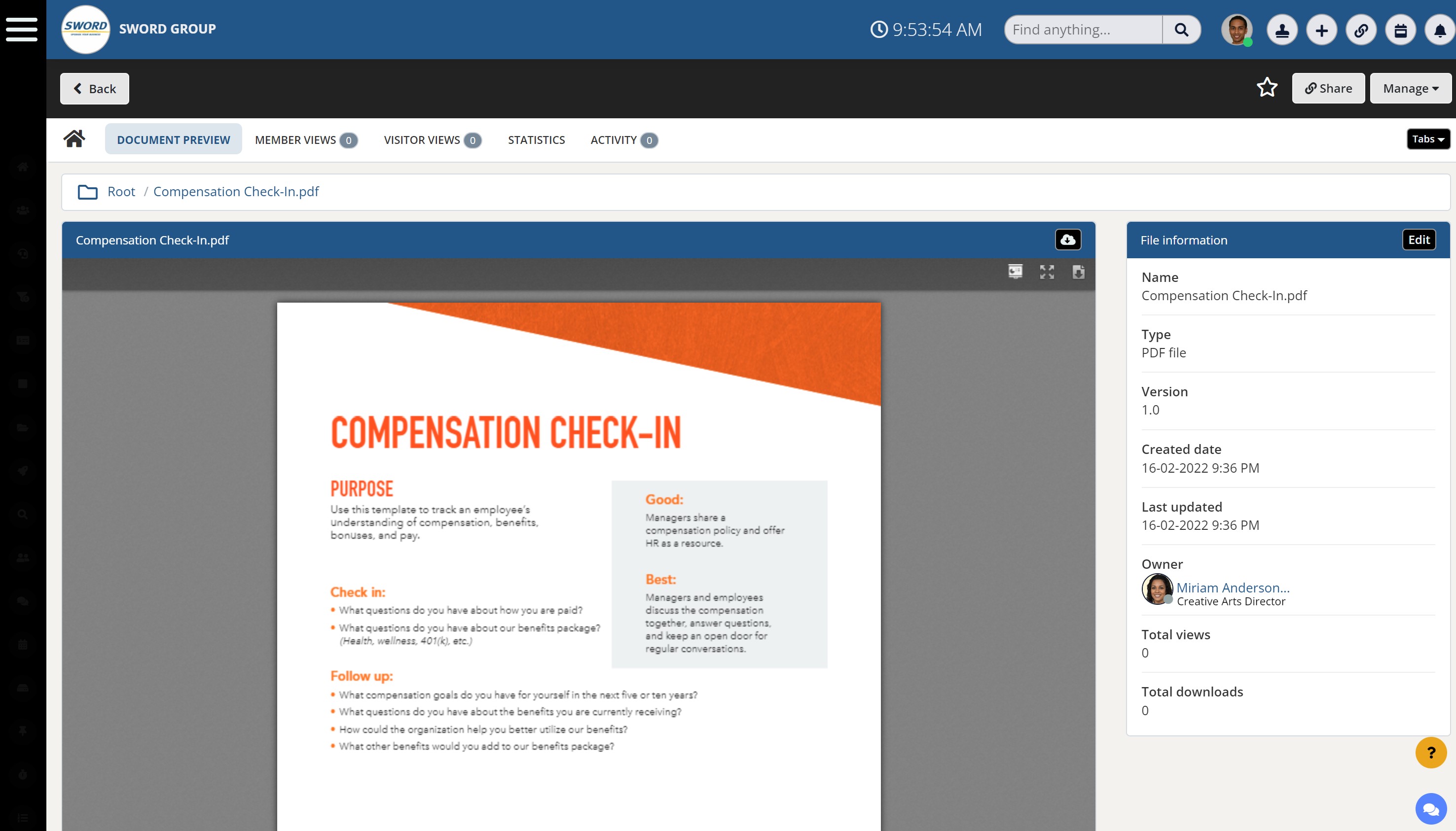 The intranet document sharing helps get work done and keep in touch with the human side of the business in real-time.