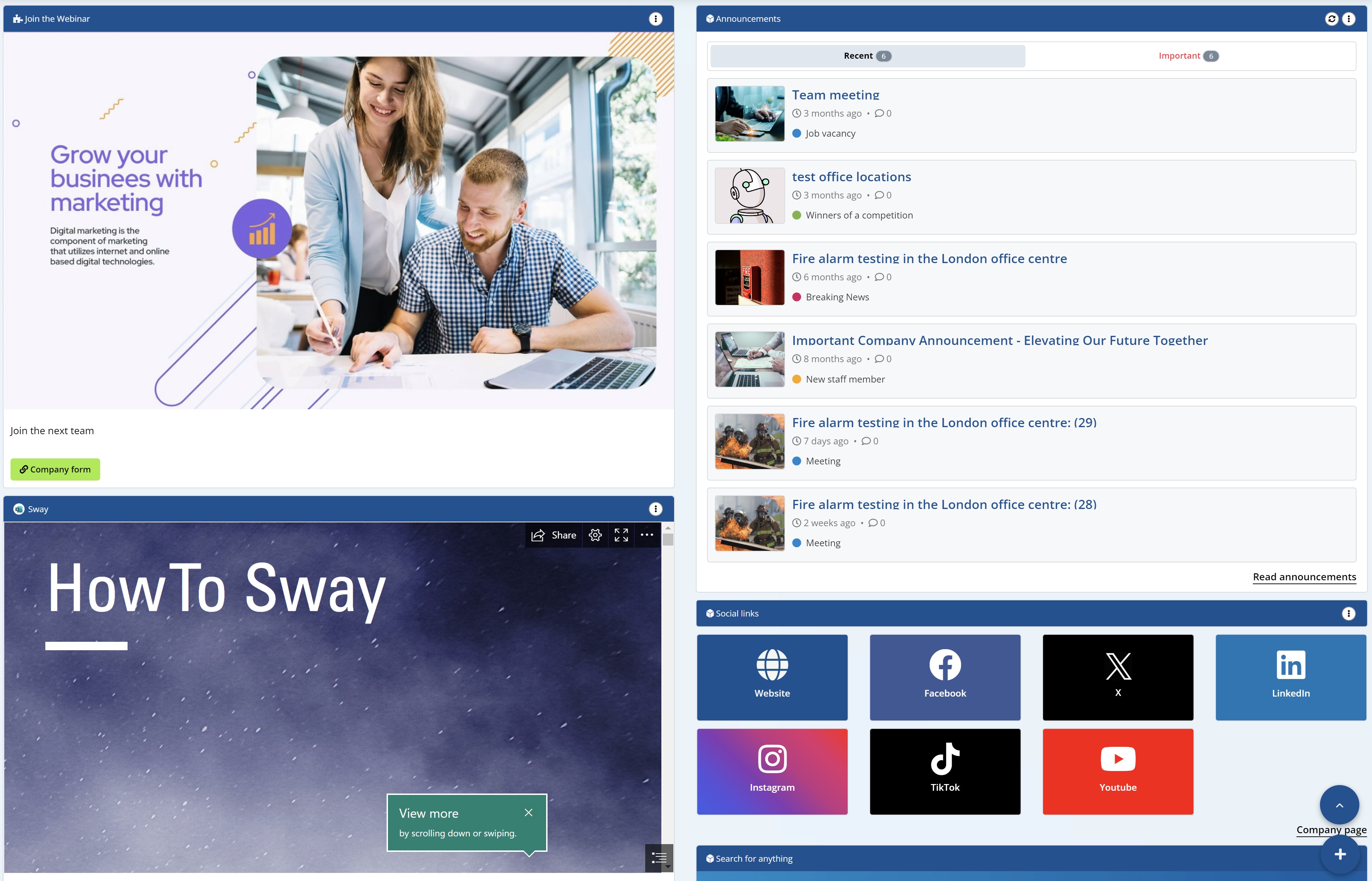 - Customizable Widgets: Tailor your intranet experience with a range of built-in and custom widgets that fit your organization's unique needs, from task management to social feeds.