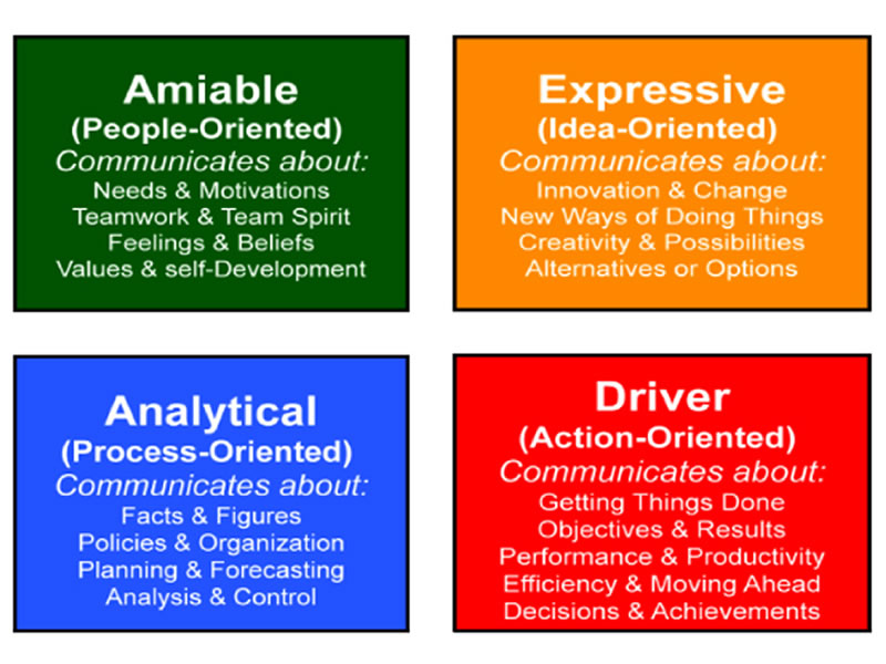 The Merrill-Reid model generates four personality types based on these categories: Analytical, Driving, Expressive, and Amiable. These are displayed as colors and are quite similar to the personality types generated by other personality models.