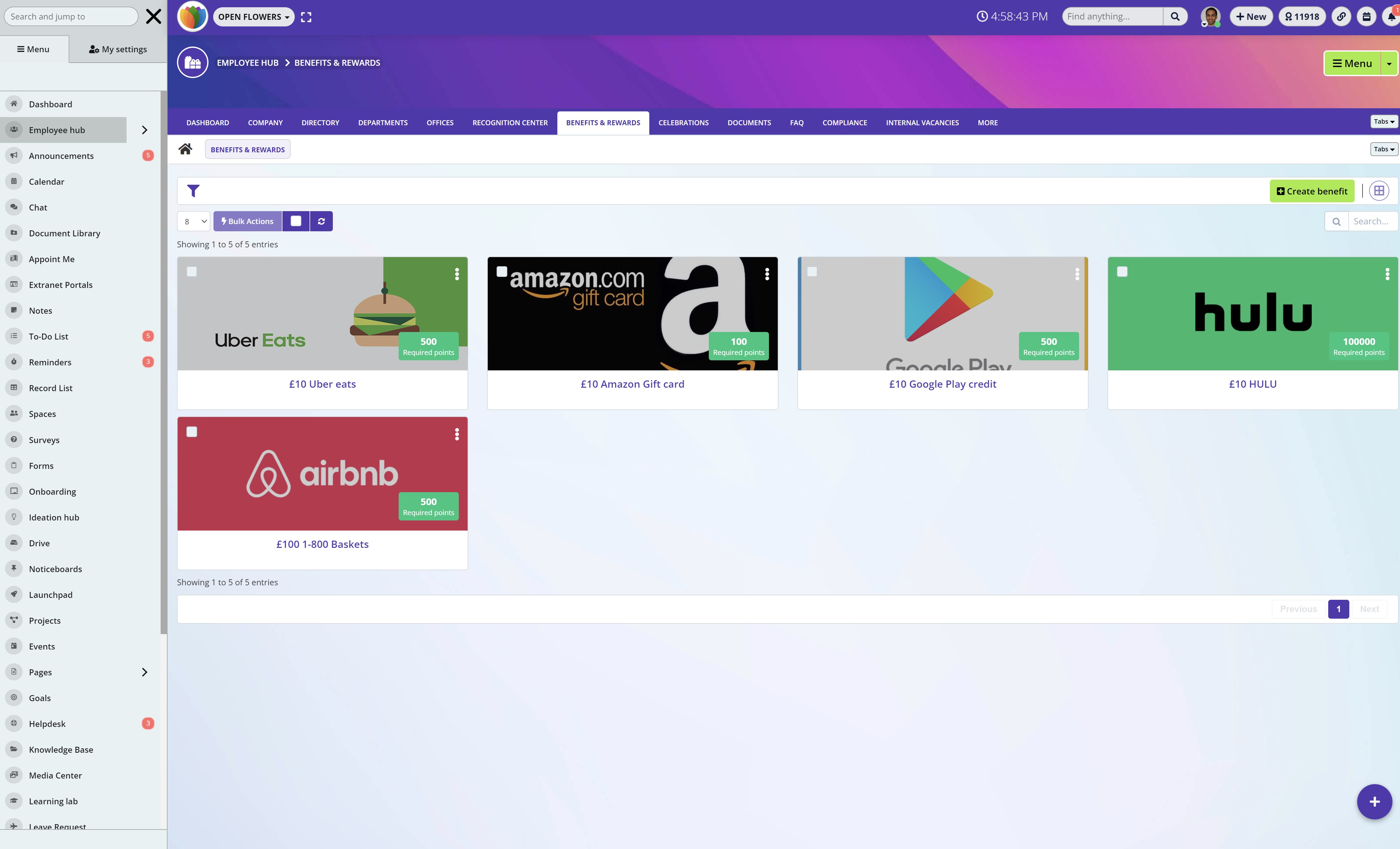 - Recognition & rewards: Express employee appreciation through digital recognitions, heartfelt messages, and rewards that can be redeemed for their preferred gift cards. You can recognize individuals privately or share accolades with the entire team via the company feed, fostering a culture of recognition and engagement.