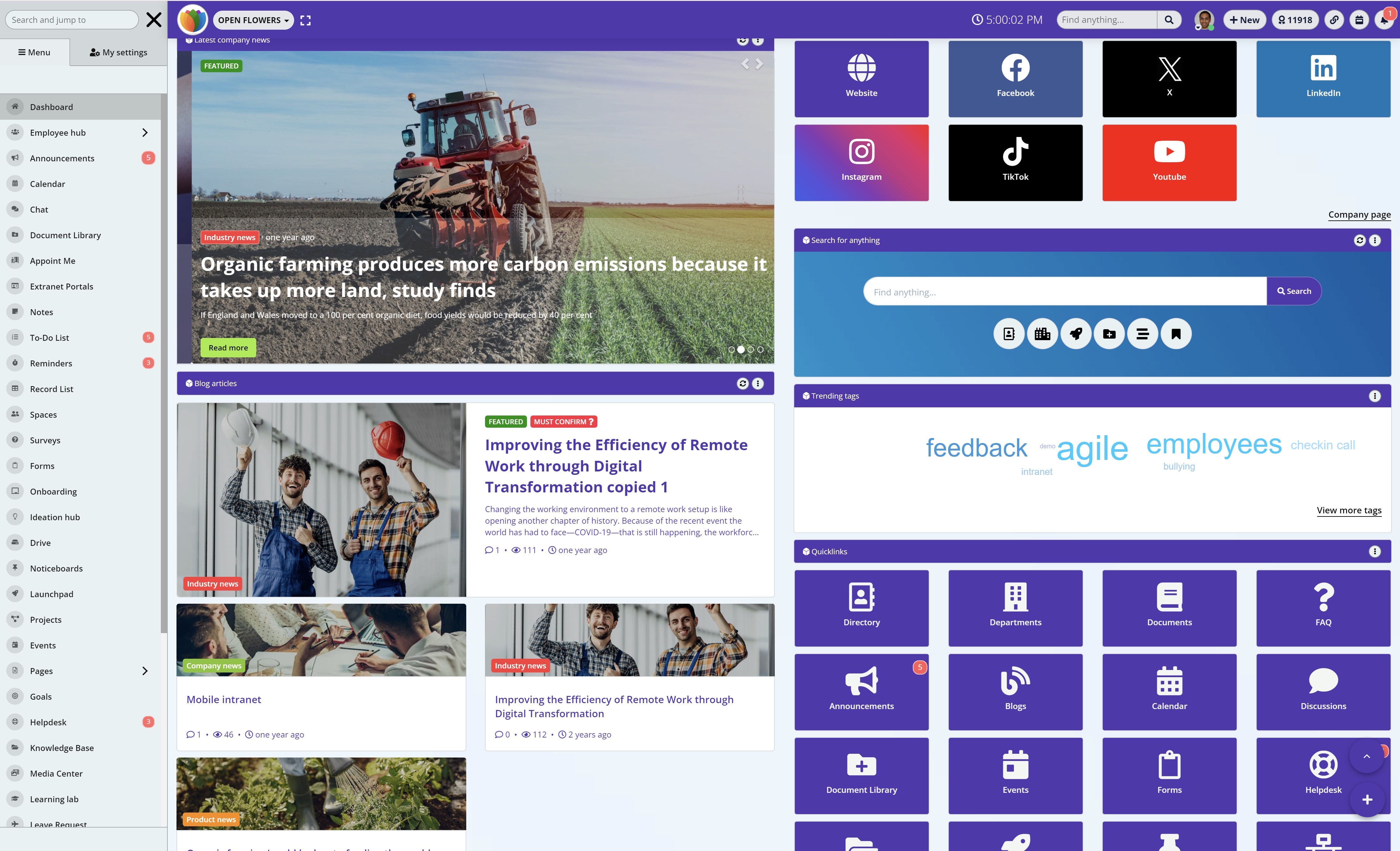 - Updates and announcements: Share news and announcements through your company feed on the app, akin to social media platforms. Monitor views and reads to ensure effective message dissemination across the organization.