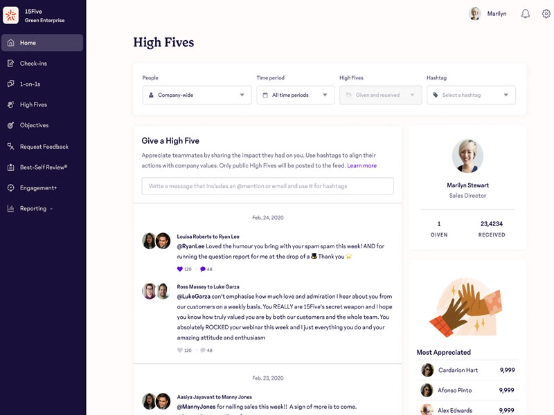 | 15Five | - Weekly check-ins - Goal tracking (OKRs) - Peer recognition - 360-degree feedback - Performance reviews | Starting at $7 | 4.6 | 4.7 | - Combines performance management with engagement - Encourages continuous feedback - User-friendly | - Limited customization in surveys - Some features may be overwhelming for small teams |