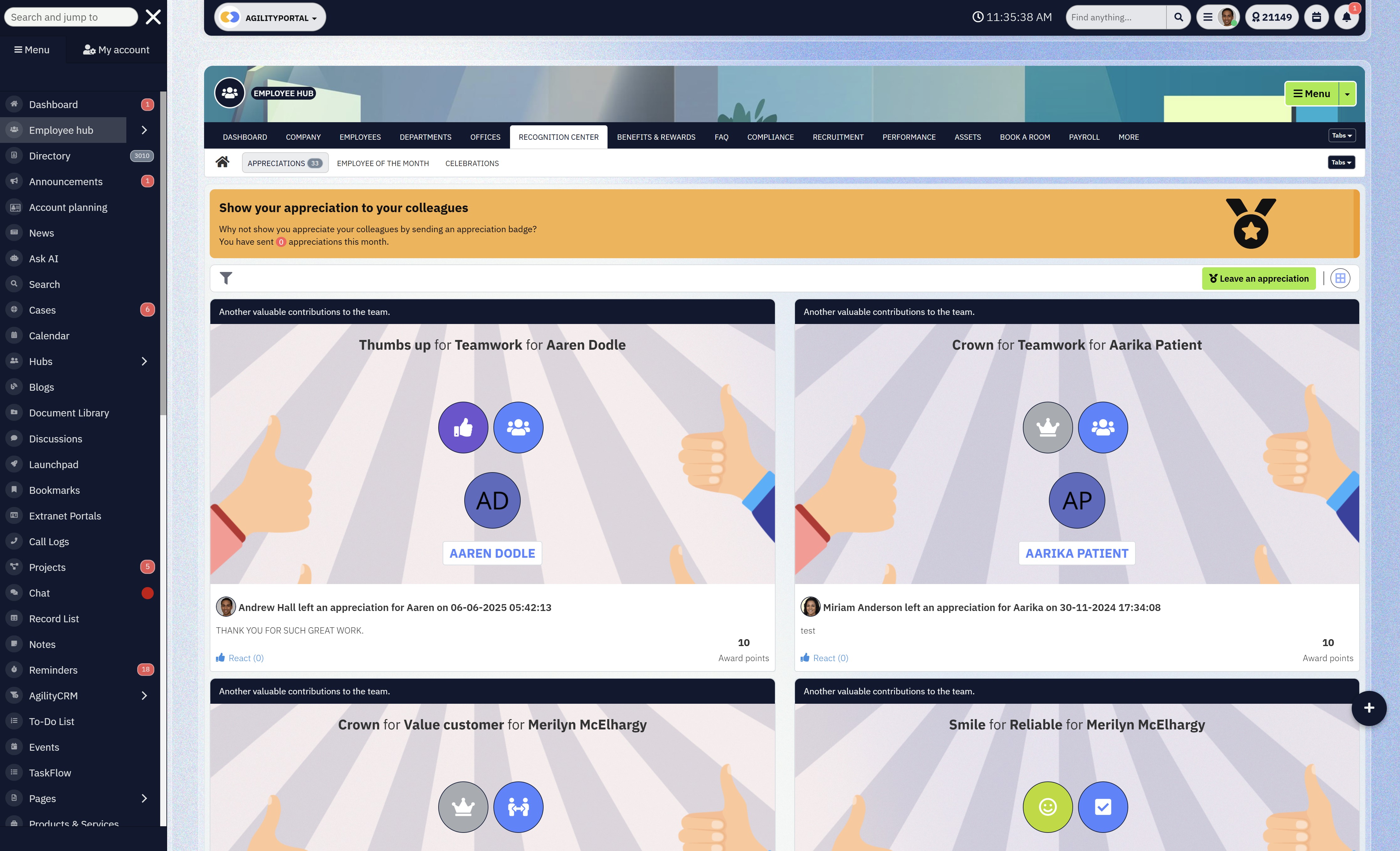 The best workplace experience software makes it easy for peers to recognize each other, celebrate wins, and mark milestones in real time.